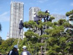 浜離宮の松の木。植木職人が4人がかりで、1本を剪定していました。背中の”庭”の文字が光ってました。自分が松の木の剪定がしっかりできるようになるには、あと何年かかるのか、、、職人はやはり、かっこいいです。
