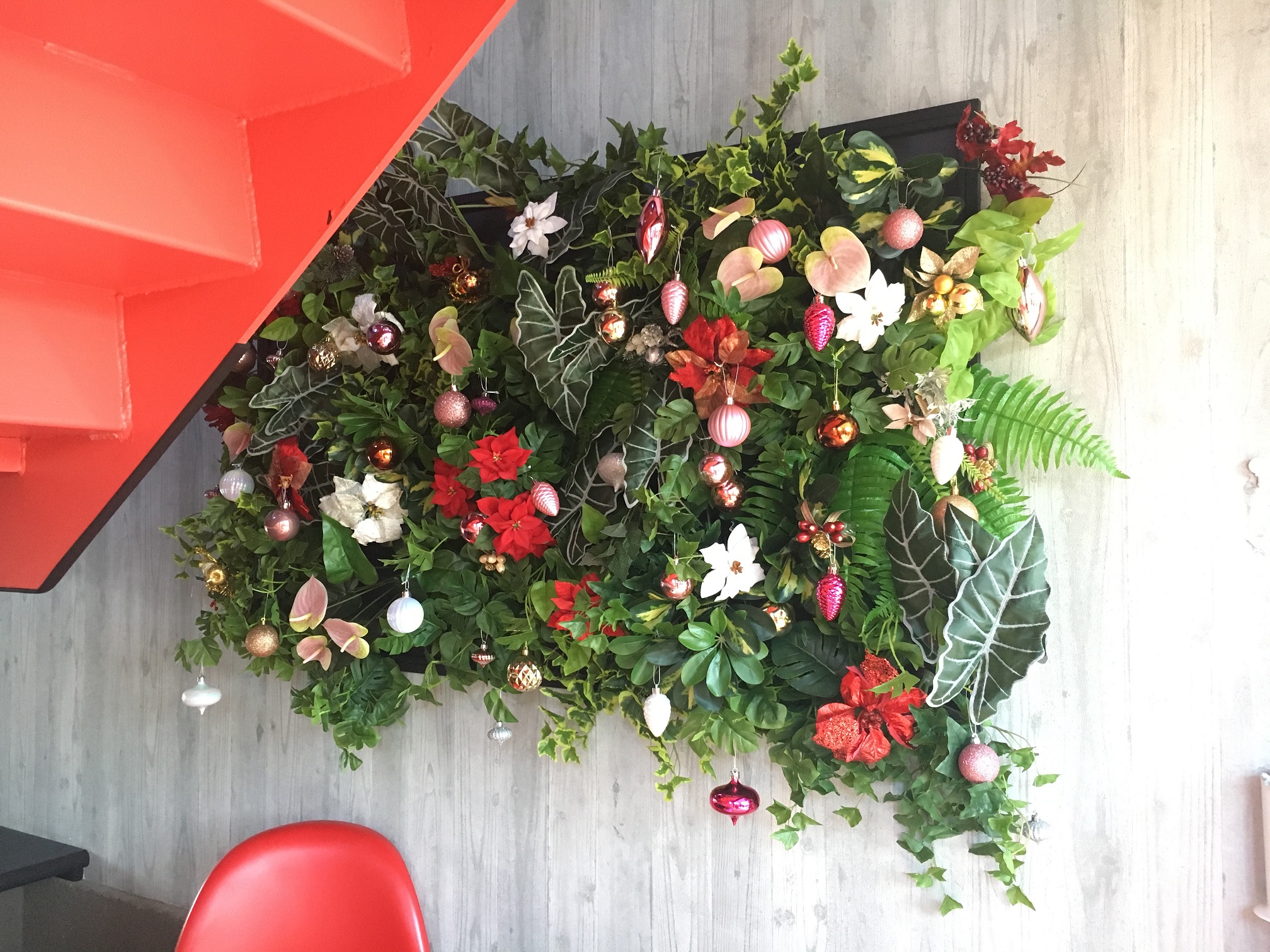 階段の赤と今回の冬コンセプトの色合いが同系色なので