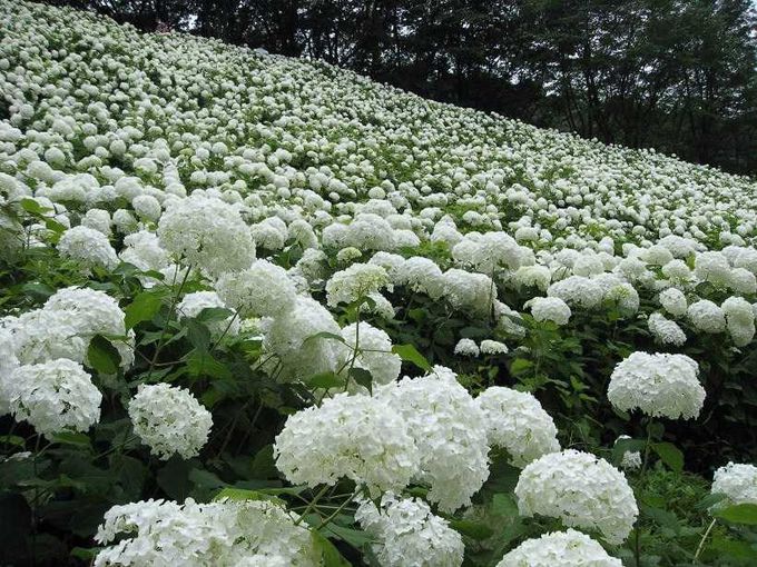 紫陽花の名所は数あれど、東京サマーランドのあじさい園は、他に類をみないほどの美しさで、特に純白のアナベルが斜面一面に咲き揃う姿は、まるで雪山のように見えることから「アナベルの雪山」と呼ばれています。(下記写真)