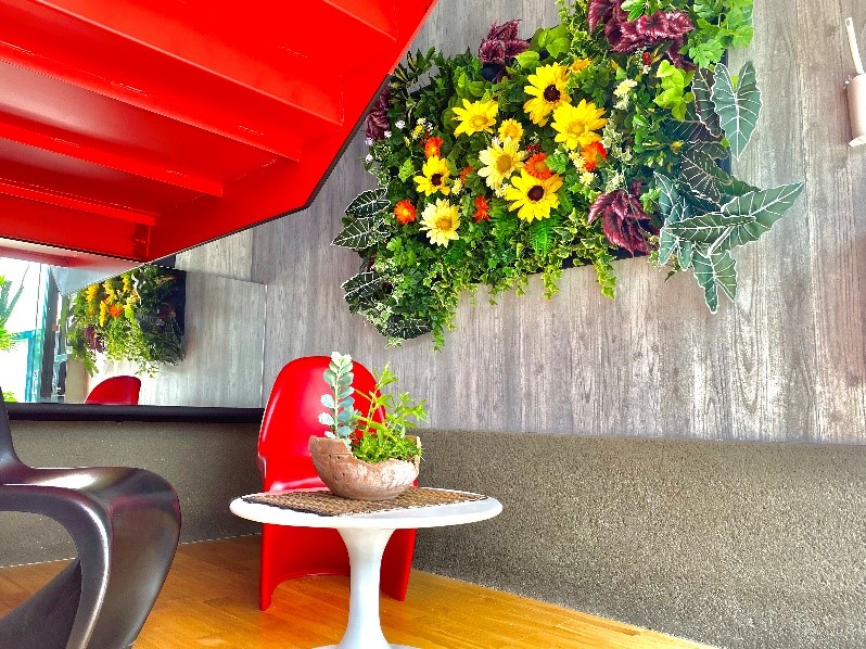 ✿うだるような暑さに生命力と迫力を感じる山々の緑は枠からはみ出る草類で、太陽のまぶしさはひまわりで表現しました