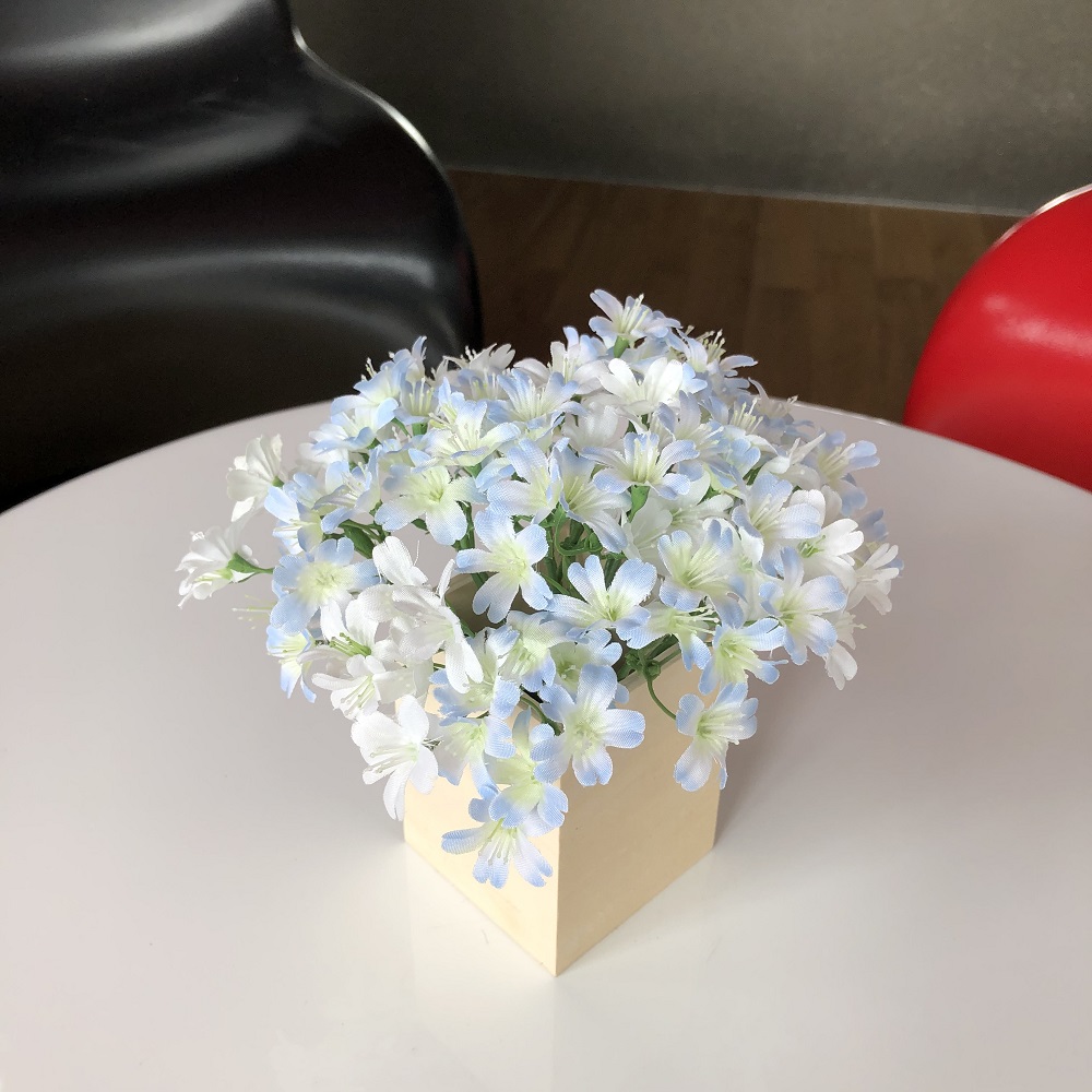 机の上に飾っている花は白と水色の小花を集めて紫陽花っぽくしてみました!